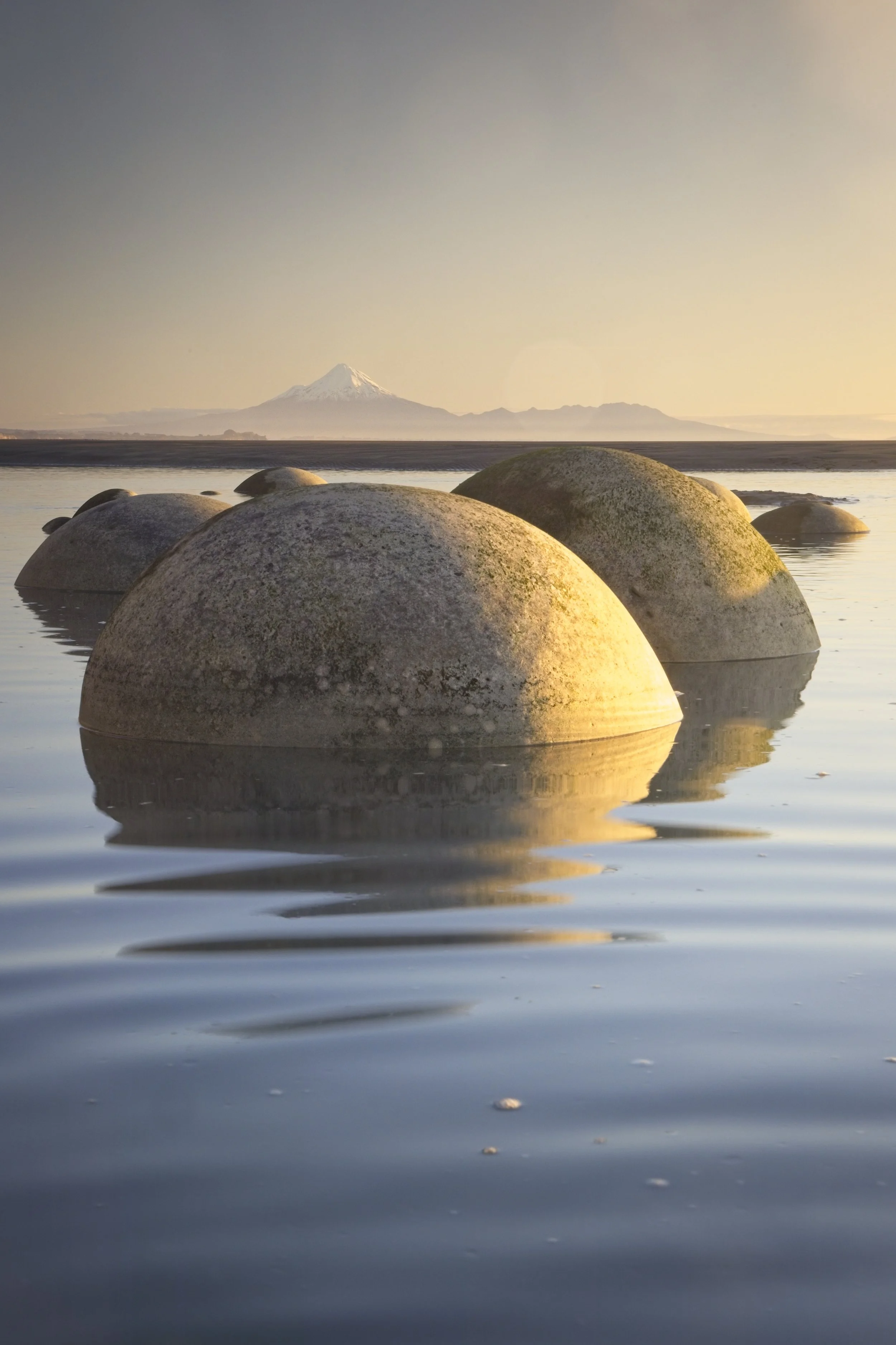 The boulders un-covered one sunset with Mount Taranaki in the background with a portrait stye image.