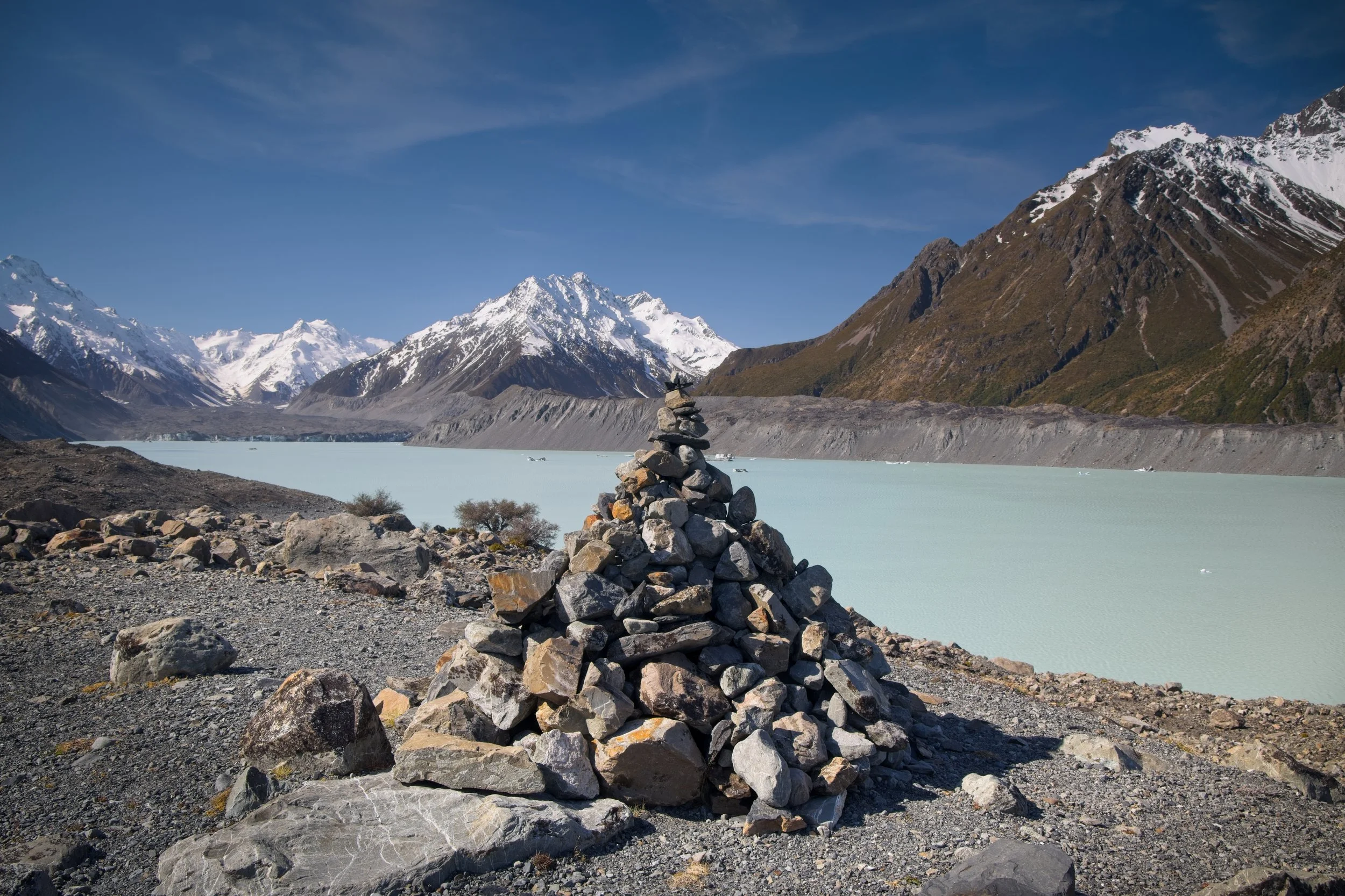 A cairn erected beside Tasman Lake looking up towards the glacier in the far distance.