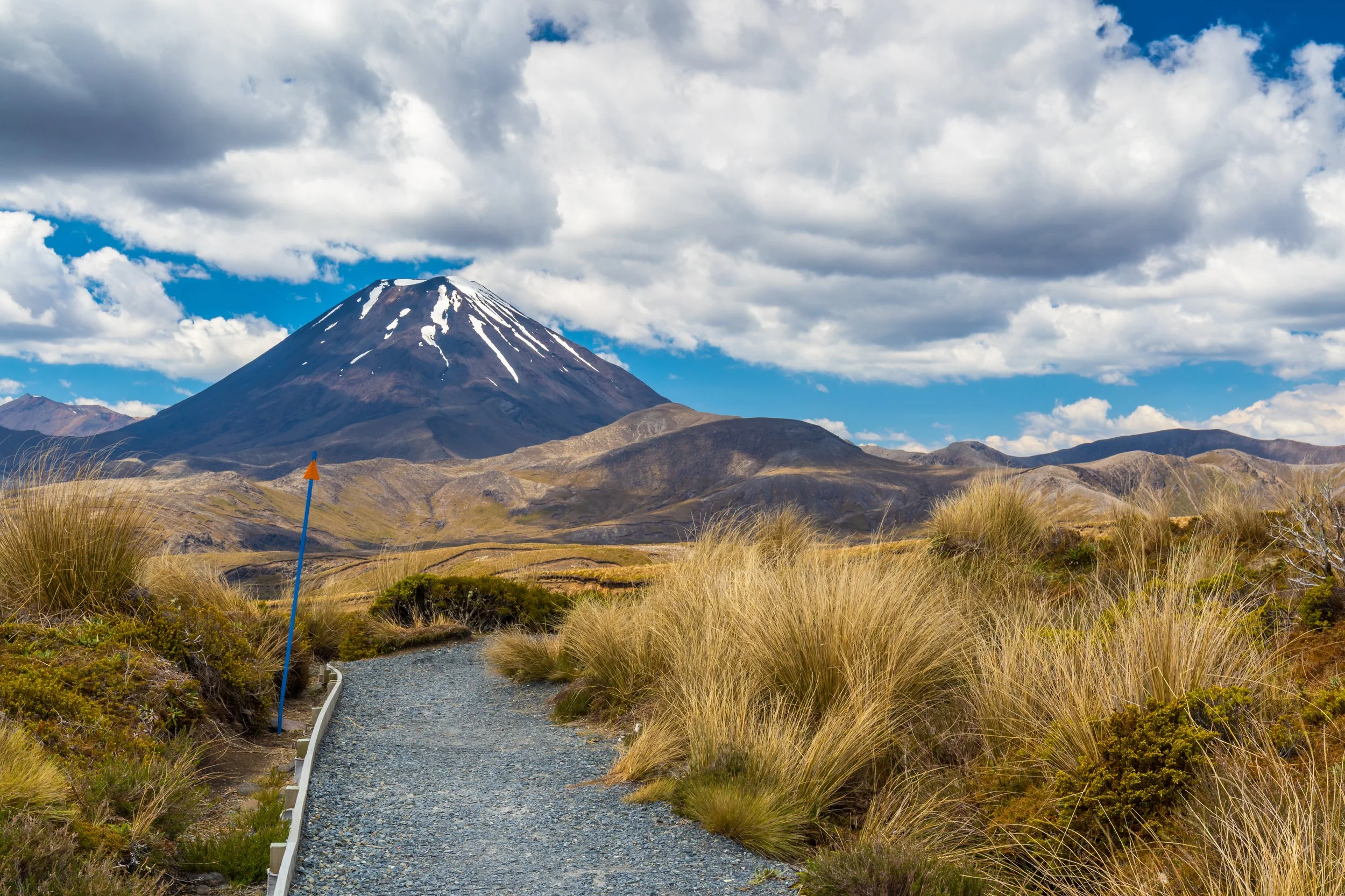 The hiking trail pointing towards Mount Ngauruhoe with golden tussock grasses bordering the formed track.