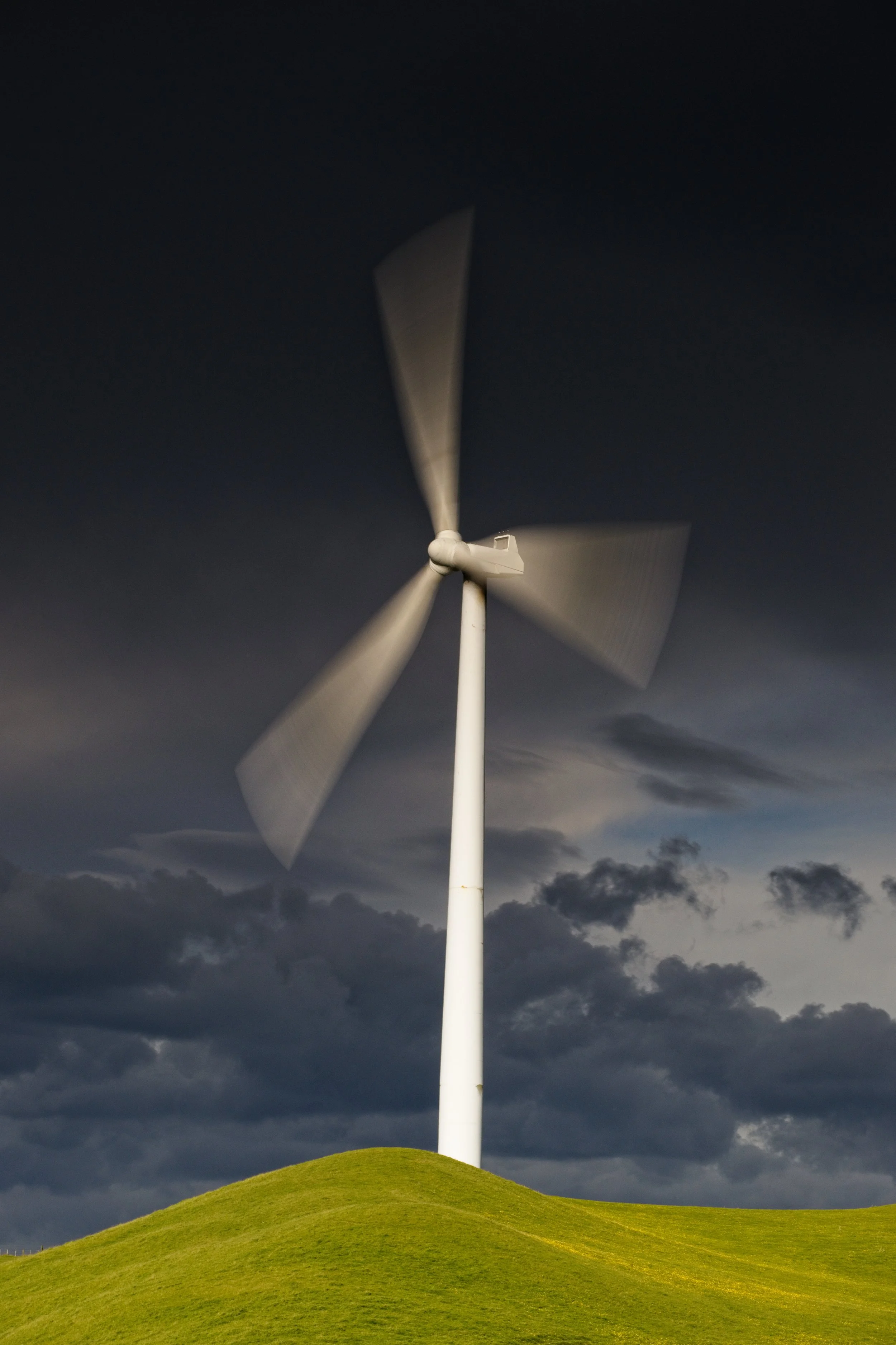 A single wind farm turbine highlighted by afternoon sunshine on a green grass covered hill with dark storm clouds in the back ground.