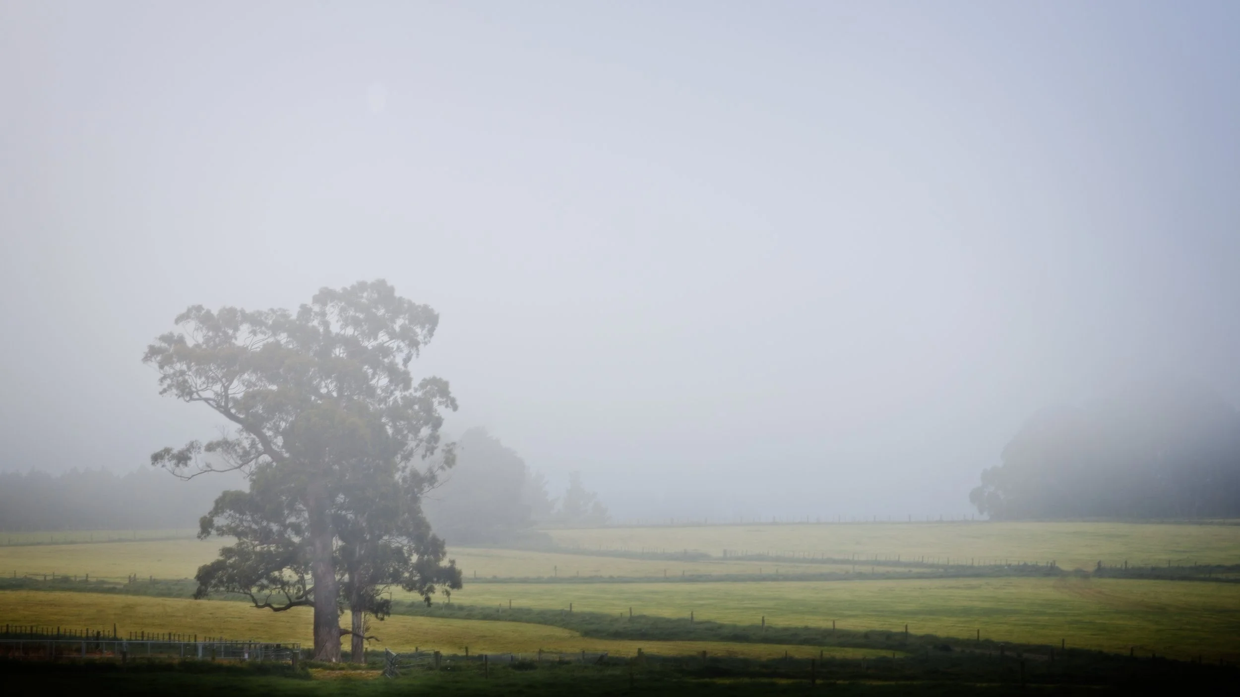 A lone tree surrounded by freshly harvested fields and a layer of mist shrouding the distant view.