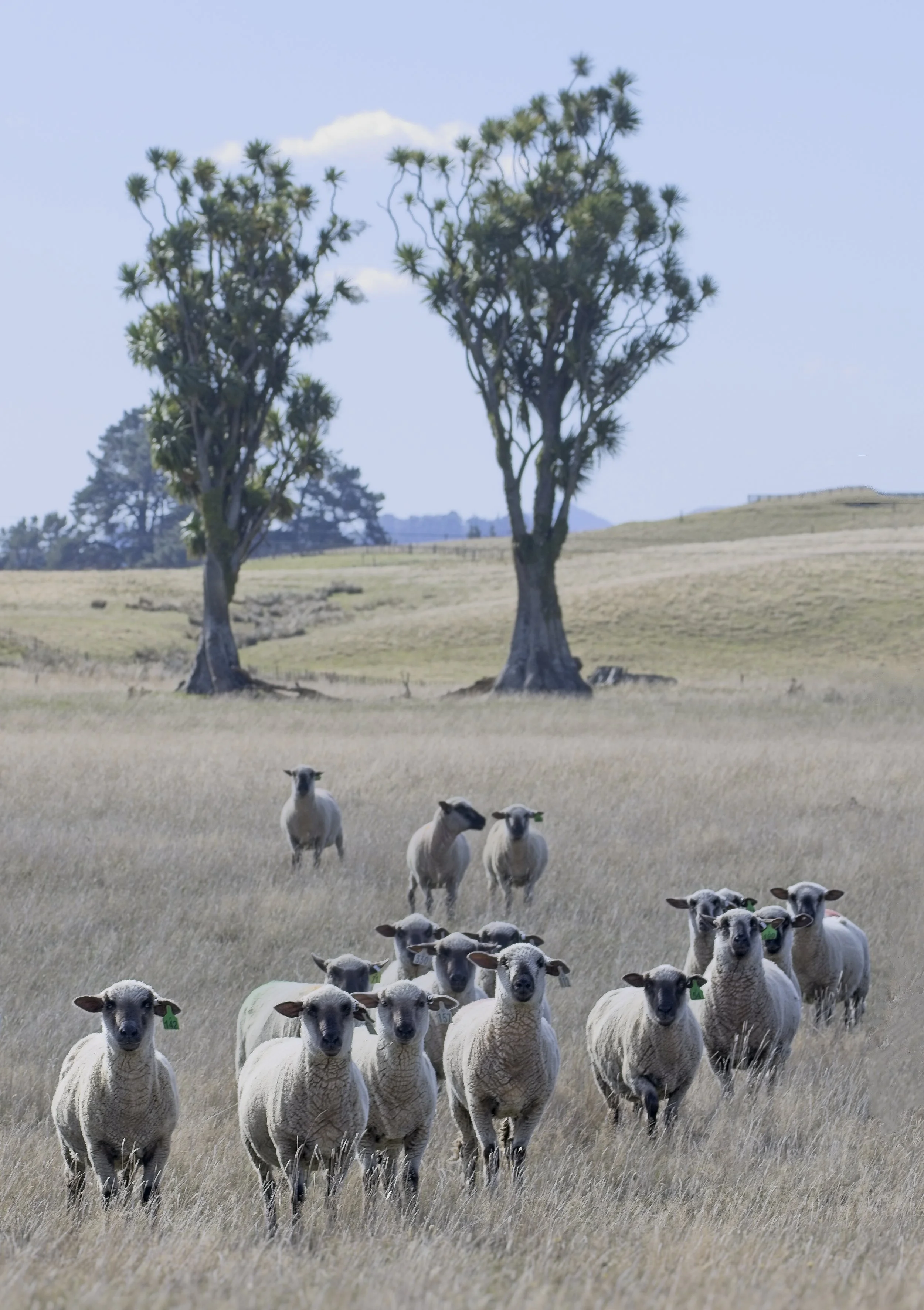 Curious flock of sheep in a paddock of summer grass with iconic Cabbage trees as a backdrop.