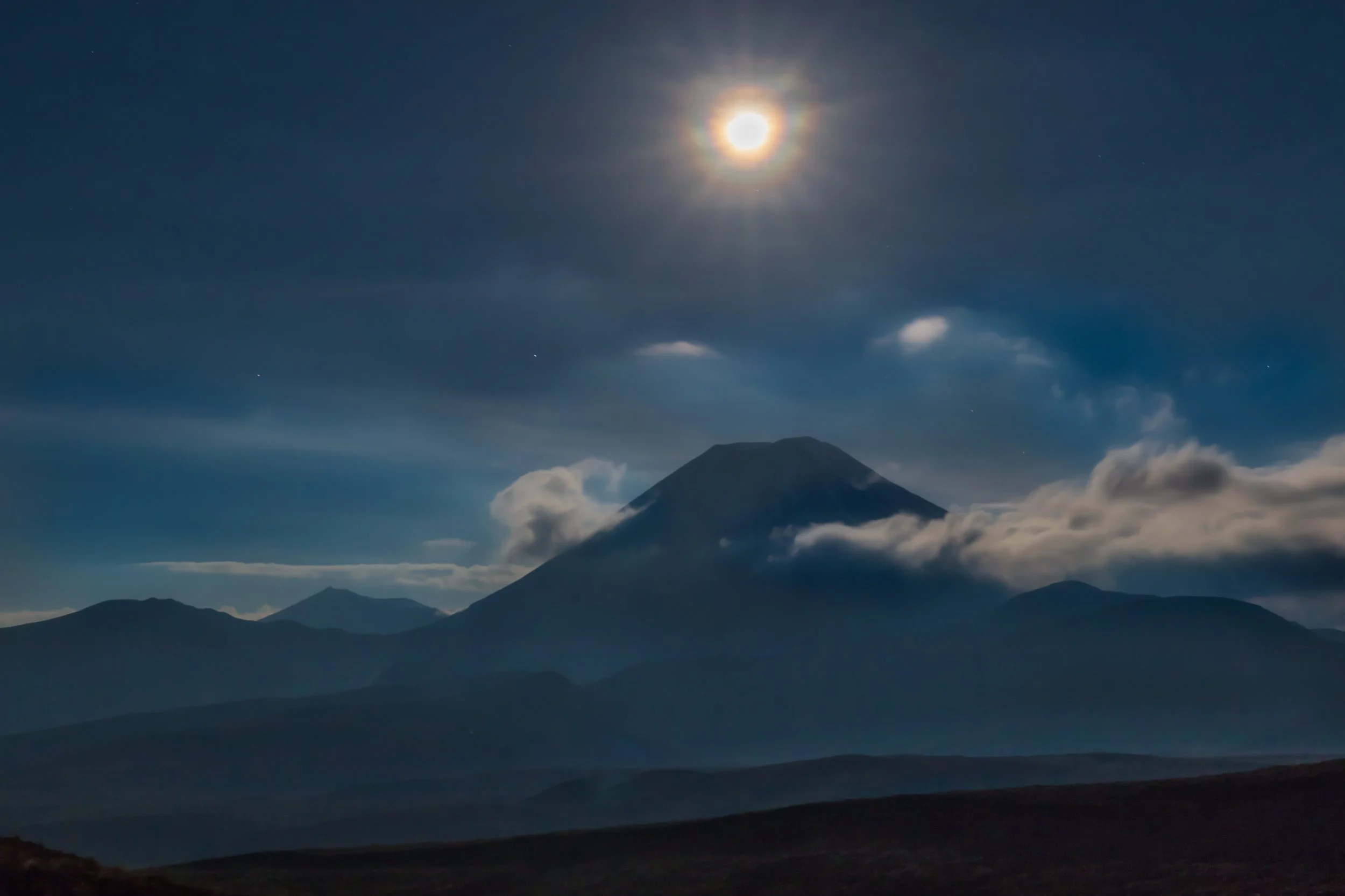 Mount Ngauruhoe with wispy cloud under a full moon.