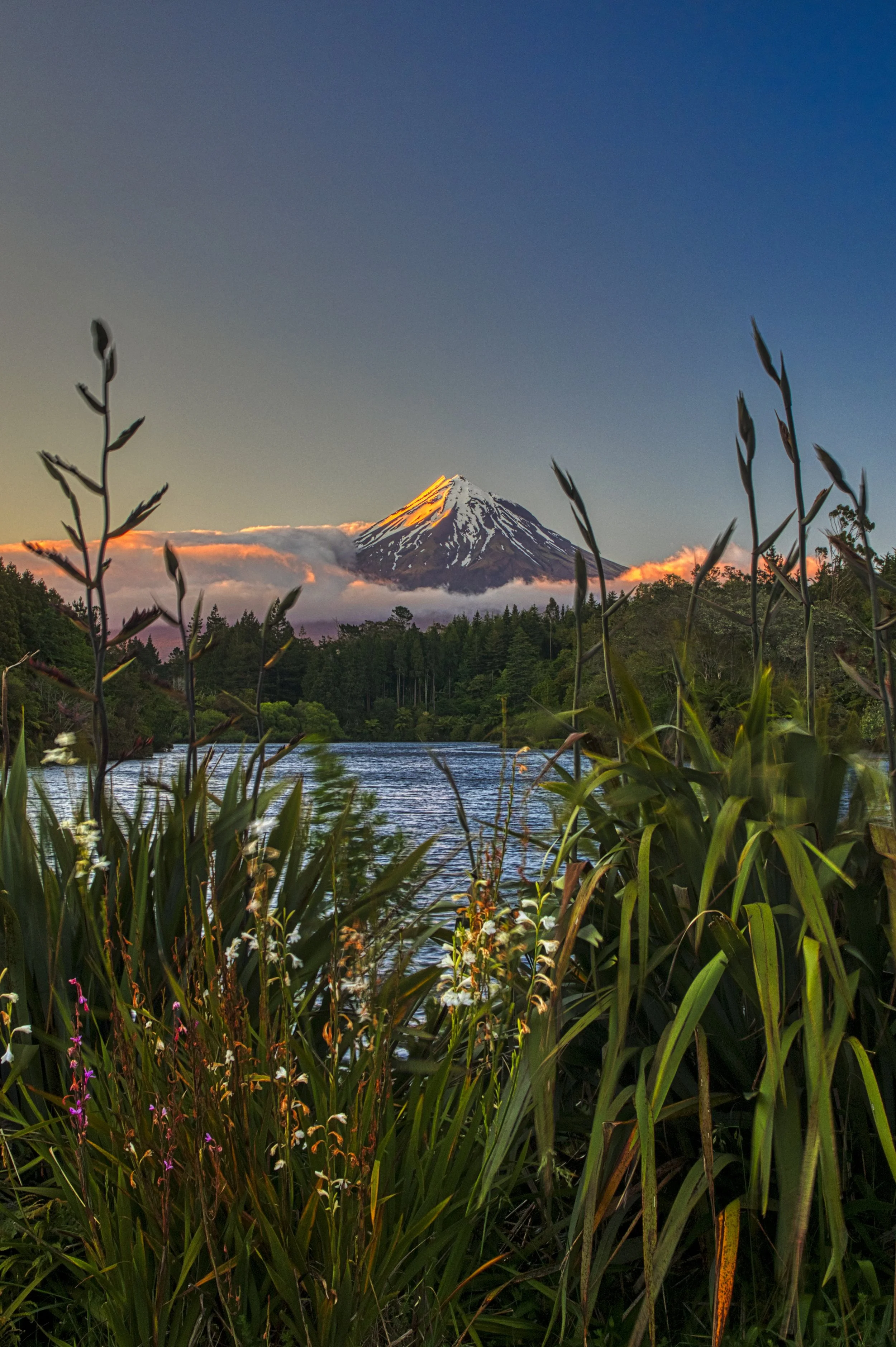 Mount Taranaki with golden sunrise light looking from Lake Matamahoe.